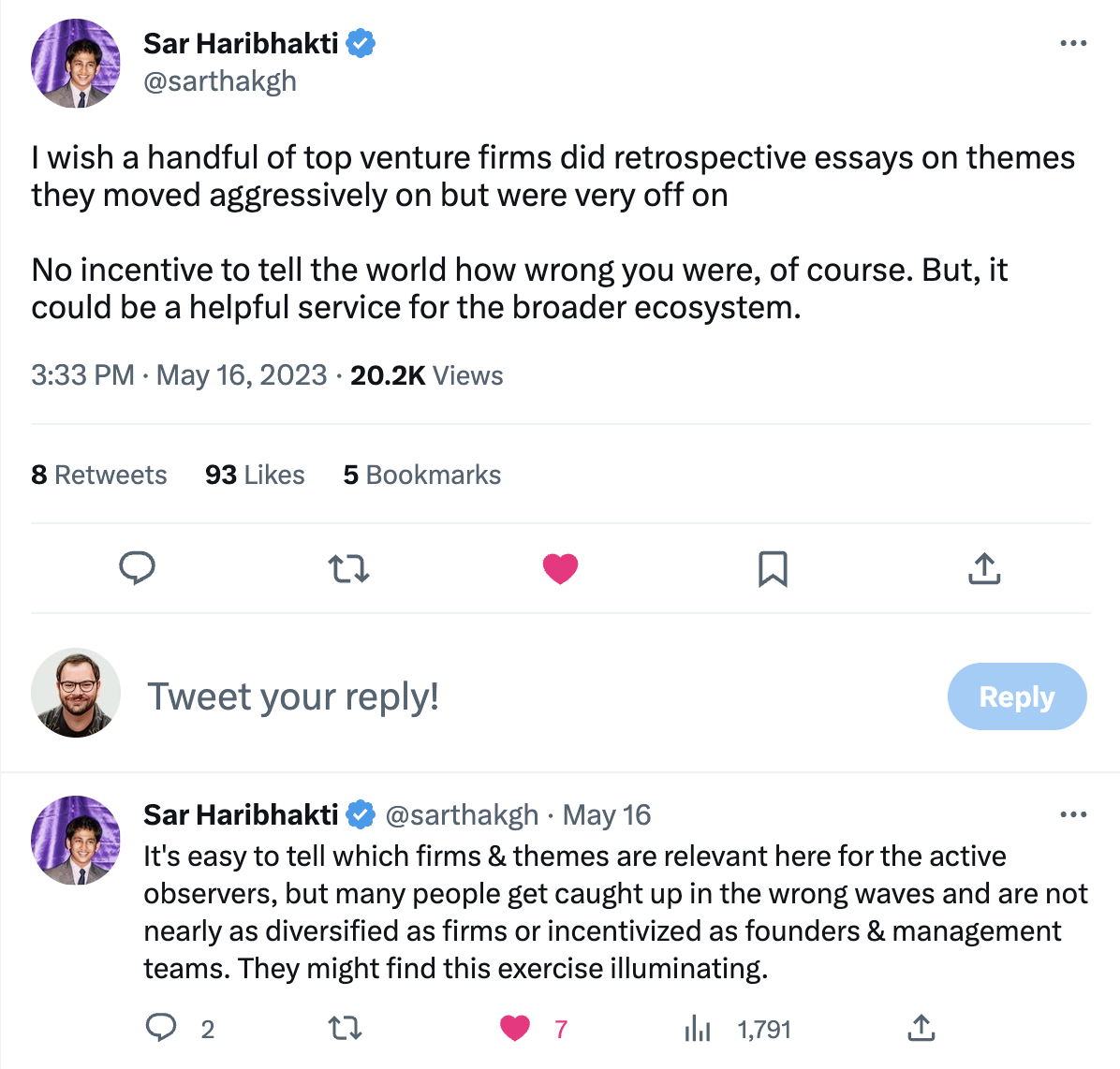 Both of these requests are slightly different, but the core is the same: “I wish more VCs would articulate what they thought was right, why they got it wrong, and what they learned from it.” There are certainly isolated instances where a VC might reflect on something in a blog post. But there is rarely an entire overview, and certainly not when the VC is still invested in companies that were the result of that thesis.