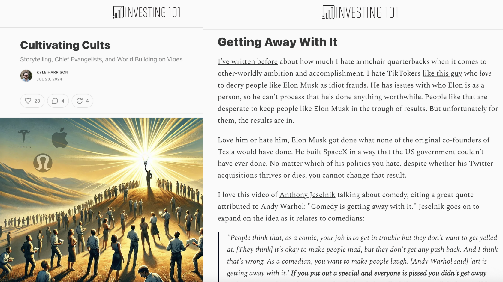 Then, in July 2024, I finally got around to writing that piece. And I remembered the quote from Jeselnik, not just because I had tried to memorize it, but because I had put it on my latticework that I was building around “cults” specifically.