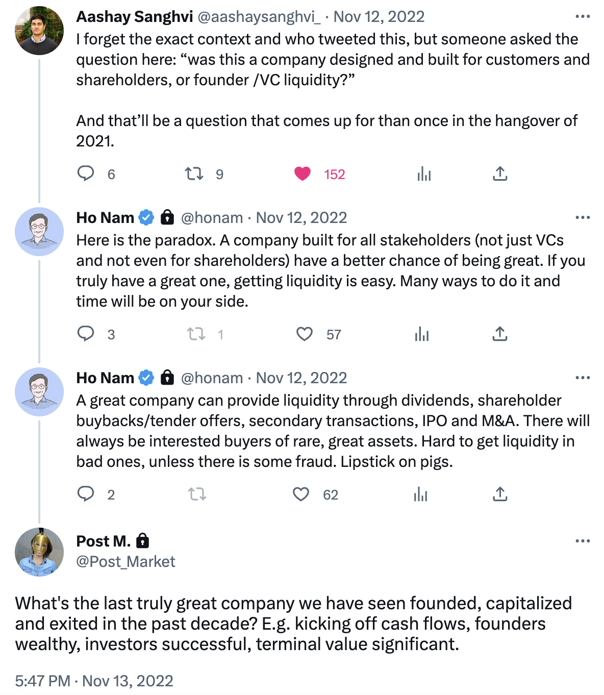 “Here is the paradox. A company built for all stakeholders (not just VCs and not even for shareholders) have a better chance of being great. If you truly have a great one, getting liquidity is easy. Many ways to do it and time will be on your side. A great company can provide liquidity through dividends, shareholder buybacks/tender offers, secondary transactions, IPO and M&A. There will always be interested buyers of rare, great assets. Hard to get liquidity in bad ones, unless there is some fraud. Lipstick on pigs.”