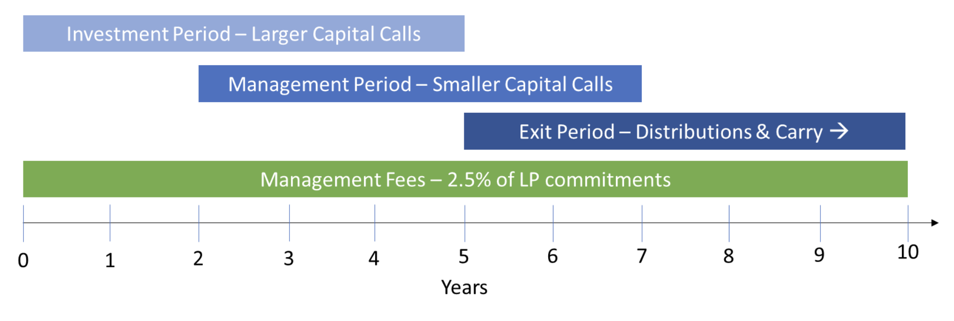 Over the course of the first few years, you’ll start making large capital calls so that you can make investments. After the first 2-3 years, that pace will slow down, you’ll be making fewer investments, or mostly just making follow-on investments. By year 6-7 for that fund, it’s just a waiting game. You’ve probably raised another fund and am deploying that, so for my previous fund I’m just helping and waiting for exits.