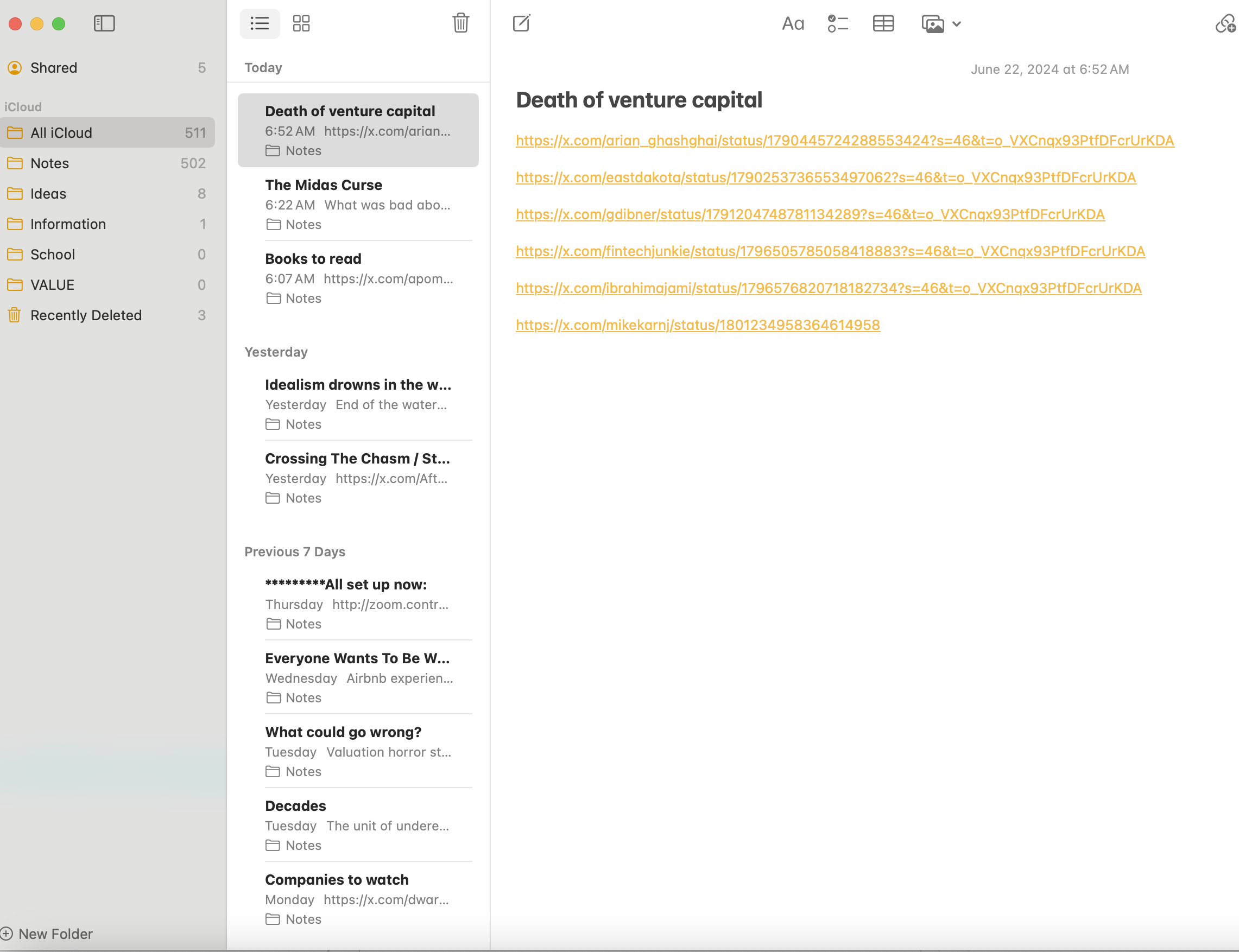 My system for tracking these fleeting thoughts has evolved over time. In 2020 I was obsessed (like really obsessed) with Roam, and recommended it to everyone. Don’t get me wrong, I’m still an hourly active user (I’m literally writing this in Roam right now). But I’ve come to accept that Roam isn’t for everyone. Even for me, my Roam graph is too big so it doesn’t load on their mobile app, so I’ve been having to capture random ideas on the go in my Apple Notes app instead, and then I transfer them later.