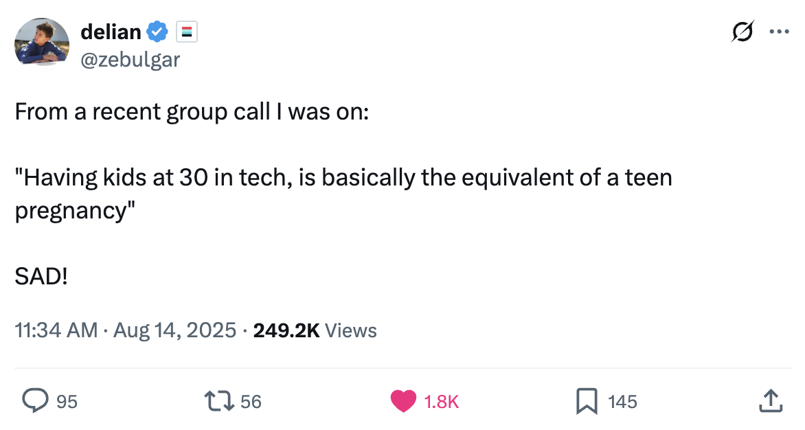 The final fundamental qualifier from Delian’s tweet isn’t that the person is saying “having kids is like a teen pregnancy,” but that “having kids in your 30s is like a teen pregnancy.” So its not don’t have kids, its just don’t have kids (yet).