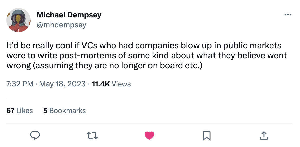 Models that rely heavily on the interplay between a limited number of trusted partners, like Benchmark, is maybe one way to come close to avoiding the perverse incentives of hyperactivity. But it’s quite difficult in venture capital to be open and honest about the mistakes you make. Part of that is a function of private companies being (obviously) private about their trajectory and traction. VCs can’t talk as openly about buys and sales the same way public investors can.