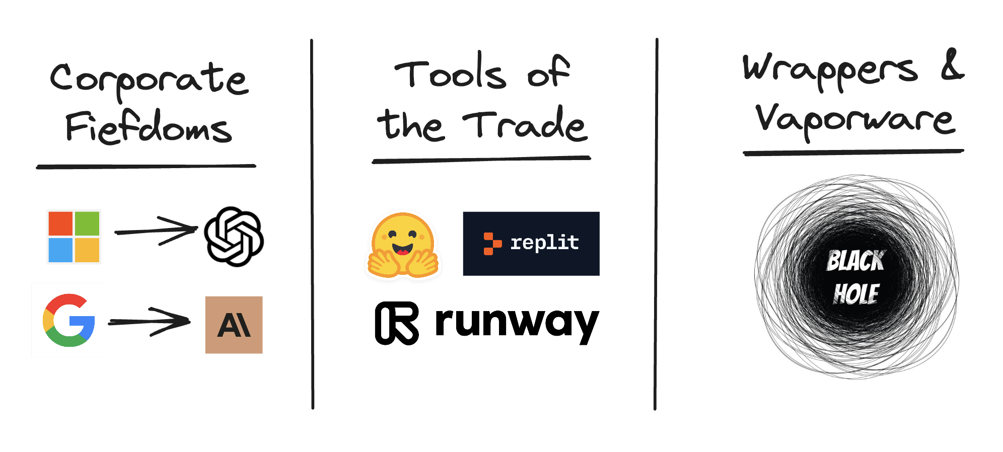 - Wrappers & Vaporware: Things that are almost entirely indefensible, often with episodic revenue, and are primarily powered by something from one of the first two buckets.