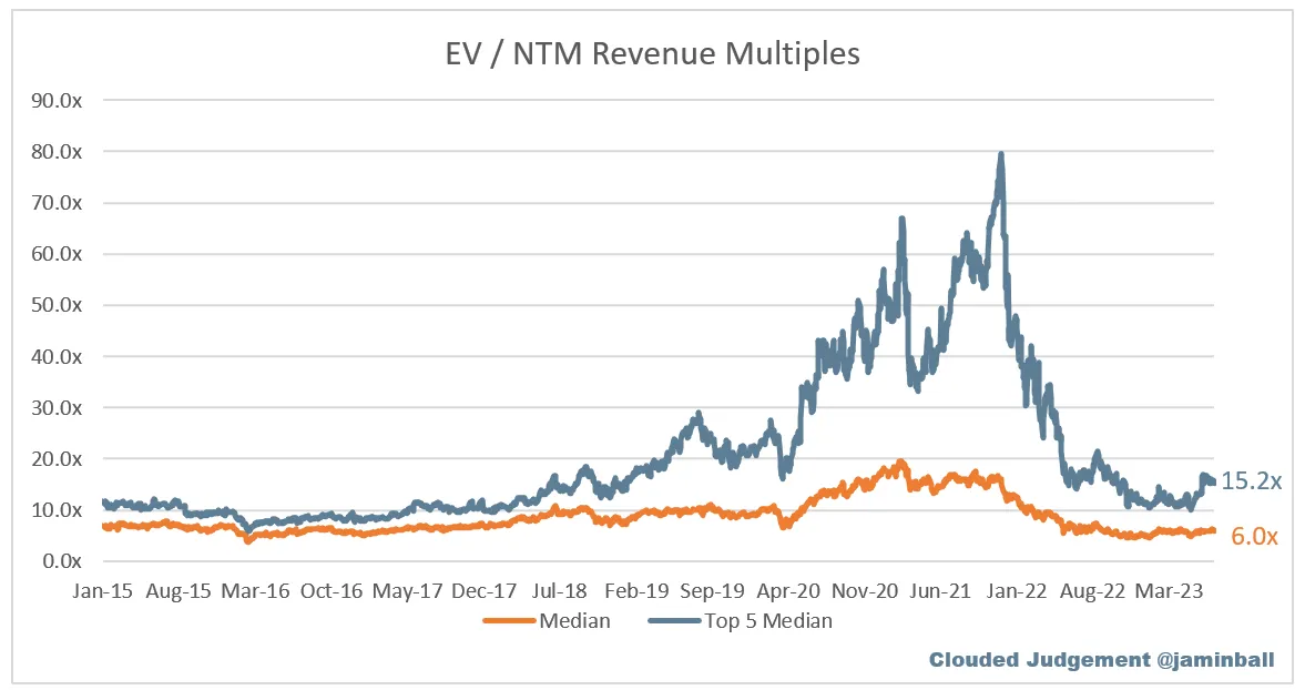 Conveniently the most clear visualization of the divide between the best and the rest comes out weekly thanks to Jamin Ball’s “Clouded Judgement.” This chart got insane in the height of 2021 when the top 5 companies were trading at 70x forward revenue. Today the difference is more measured; the top 5 trade at ~15x vs. 6x as the median.