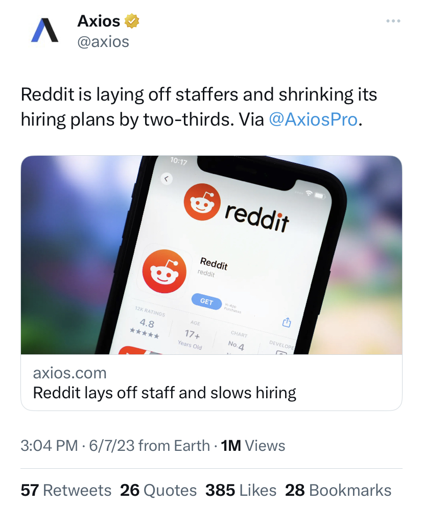 Well Reddit has actually had a much more complicated past few months. The company decided to start charging for access to its API and the roll out has been a nightmare. Turns out when you don’t make many changes to your product for decades, and then suddenly make a dramatic change, your PR muscle might be a little weak.