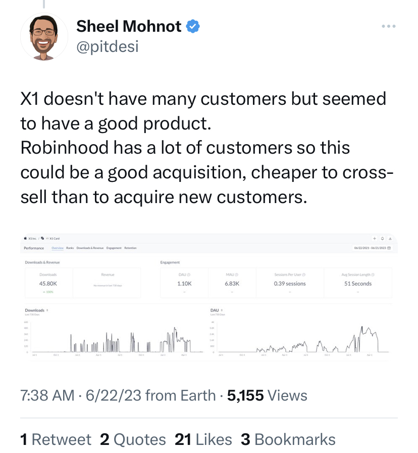 The opportunity for larger company with distribution (Robinhood) to acquire a smaller company with a particular product (X1) makes it easier for both to have more success than they likely would on their own.