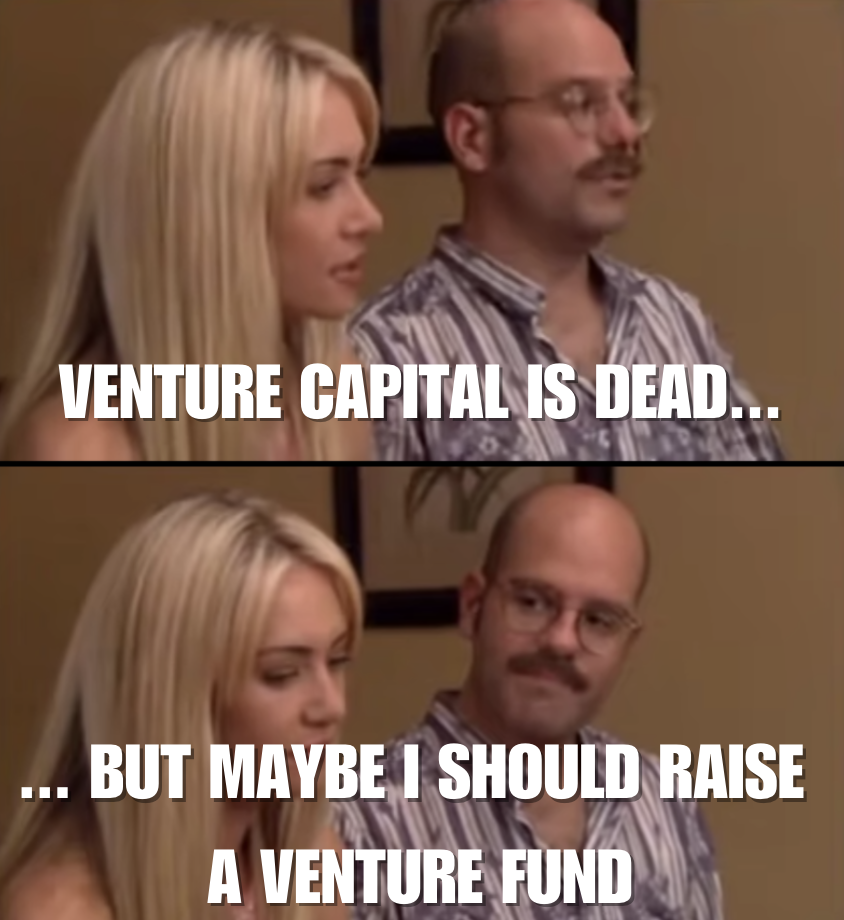 So a combination of the formidable force of capital agglomerators, the denominator problem with LPs who suddenly have over-exposed themselves to illiquid private markets without the liquidity to justify it, and the general fear people have of the broader macro climate — all of this led me to believe that few, if any, investors would start a brand new venture fund right now.