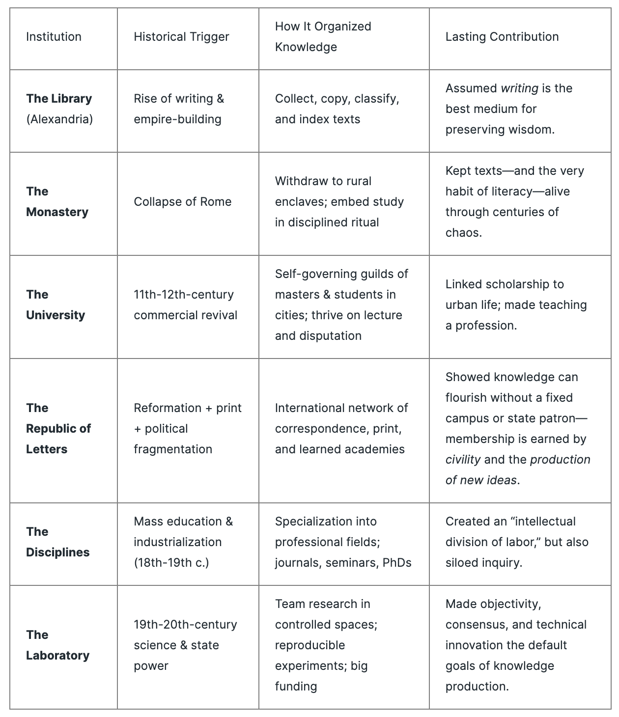 One of my Quake Books is called Reinventing Knowledge: From Alexandria To The Internet. If you’re interested, I’ll include a summary and quotes in an appendix* at the end of the piece because I love this book. But the TLDR is that its an exceptional explanation of different periods of time that have experienced similar “Republics of Letters.” From the Library to the Monastery, University, Laboratory, and beyond.