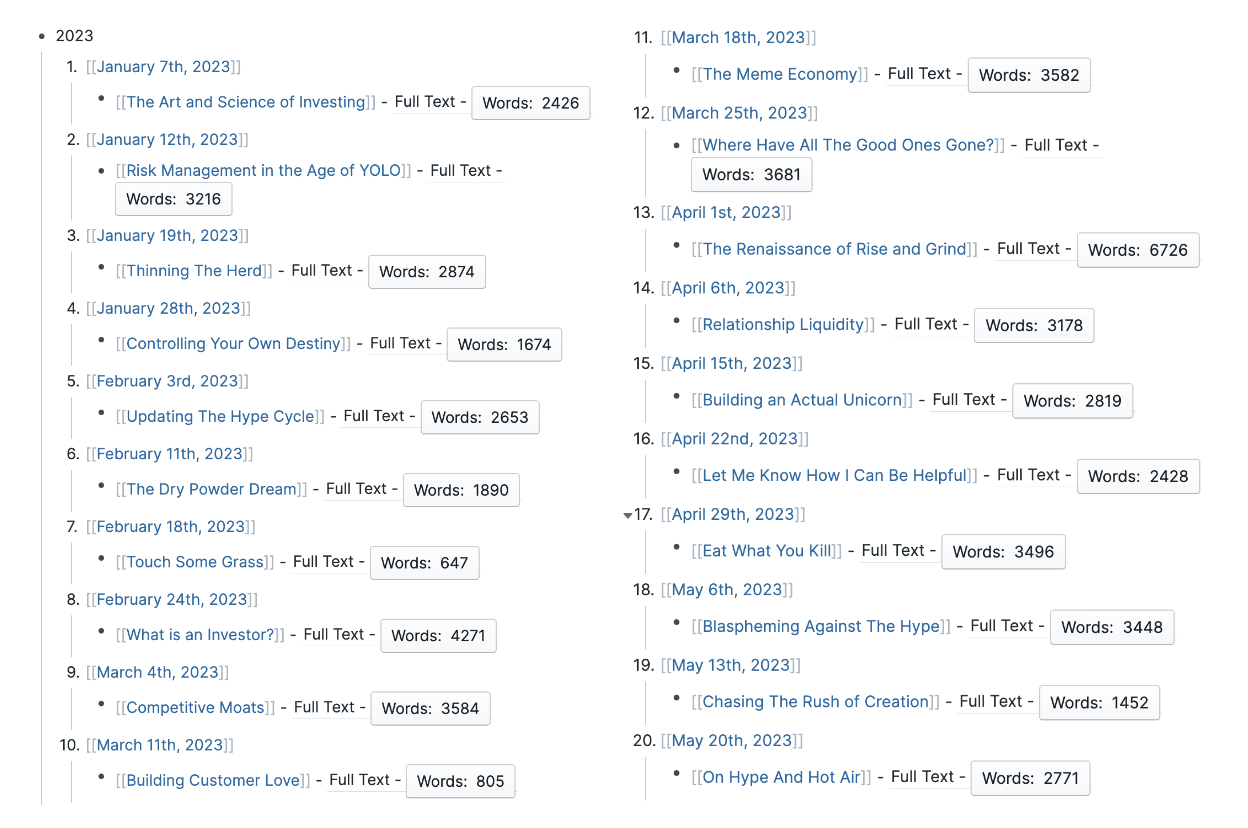 This week, as part of the Contrary Research Fellowship, we had Packy McCormick as our guest speaker. He talked about a similar evolution in his writing, where for a long time he felt the pressure to write each week. Eventually, he came to the conclusion that writing something good was more important than writing something each week. I love that.